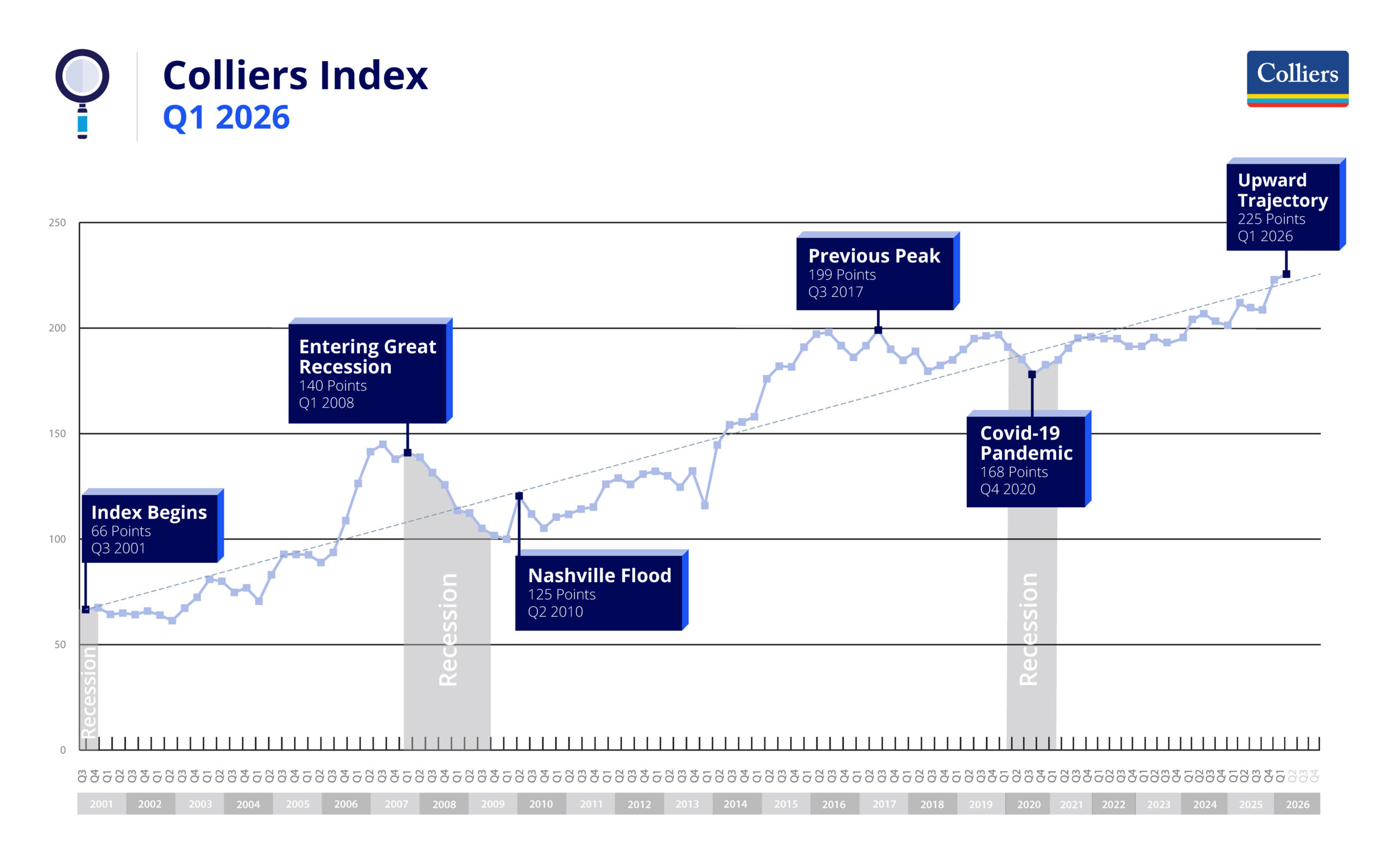 The Colliers Nashville Commercial Real Estate Index looks back at market performance beginning in the third quarter of 2001 to the present, and will track the performance of the industry sector on a quarterly basis going forward. The Index tracks a combination of economic factors, such as job growth, office absorption rates, rental rates, vacancies, rate escalations and building permit activity. These are factored into a weighted algorithm that creates a measurement tool that is an accurate barometer of the industry’s health.